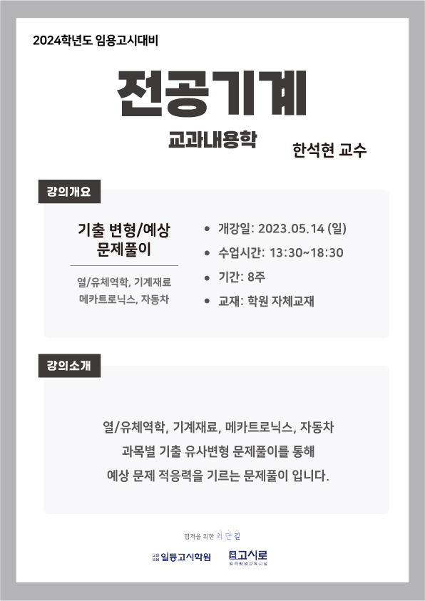 2024년대비 한석현 전공기계 <교과내용학-열/유체역학, 기계재료, 메카트로닉스, 자동차> 기출/변형 문제풀이 개강 안내입니다.