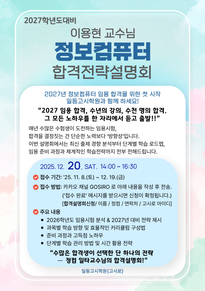 2027학년도 이용현 정보컴퓨터 임용 합격설명회(12월20일 오후2시~)당일 접수도 가능 합니다.